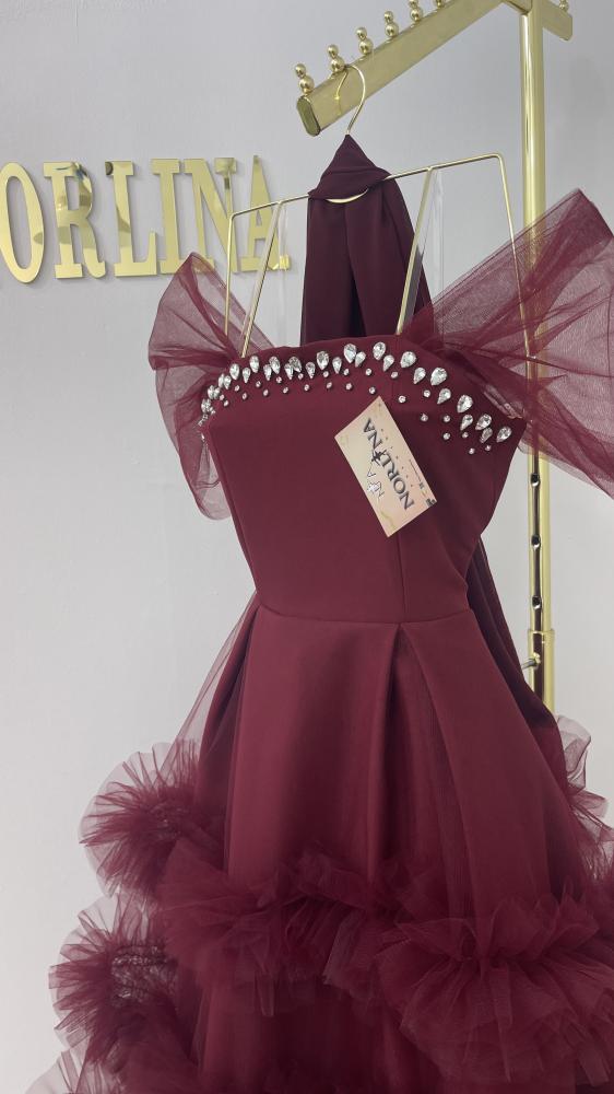 فستان بلون عنّابي مخملي، مصمم بطبقات من التول الناعم تضفي عليه لمسة فخمة ومليئة بالحيوية. مزين بحبات لؤلؤ براقة على الصدر، مع أكمام قصيرة من التول المنفوش تضيف لمسة ملكية ناعمة. مثالي للمناسبات الخاصة، الأعراس، أو جلسات التصوير.