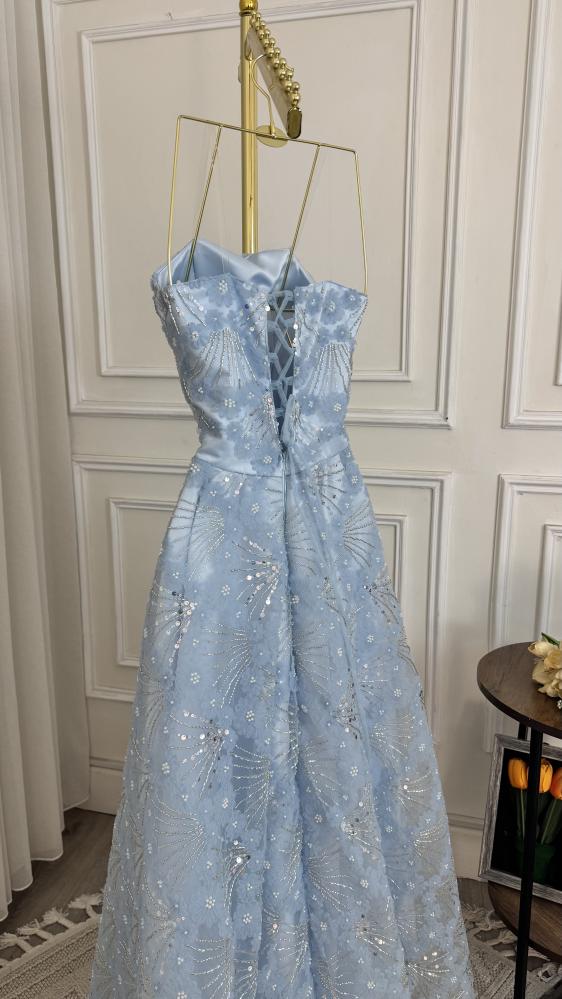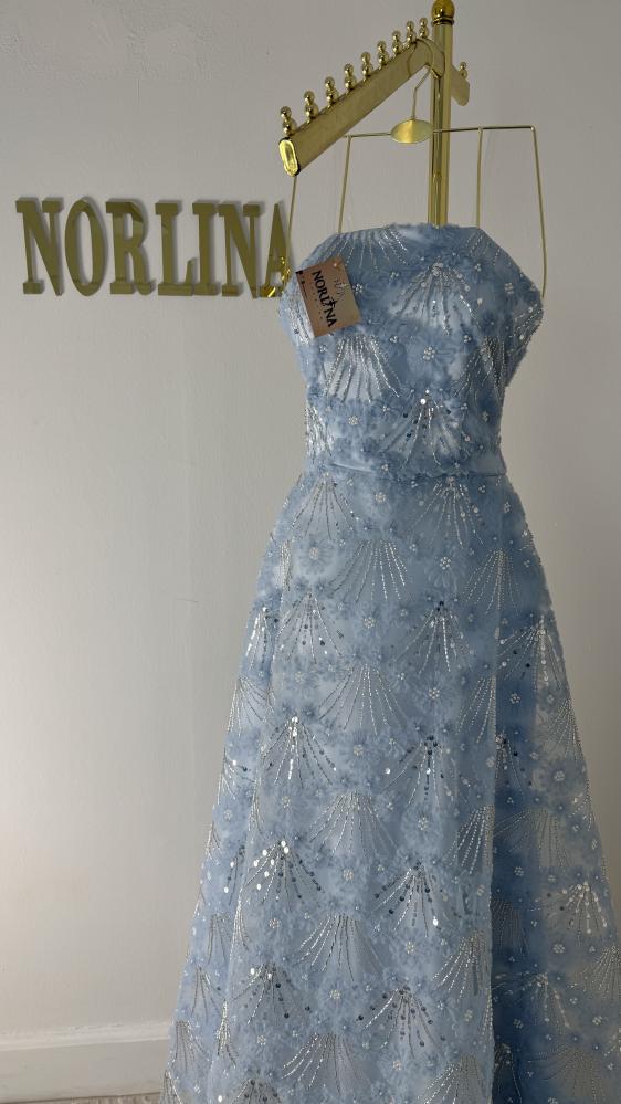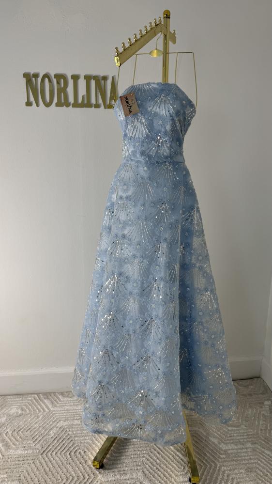 بتصميم ملكي فخم يأسر الأنظار، يأتي هذا الفستان بلونه السماوي الذي يعكس الفخامة والرقي. يتميز بقصت الكلوش الواسعة التي تضيف لمسة درامية ساحرة، وقماش التل المورد وبشك الخرز التي تضيف لمسات ناعمه