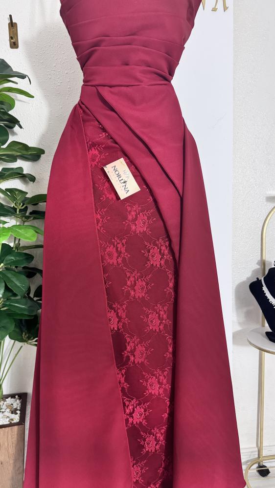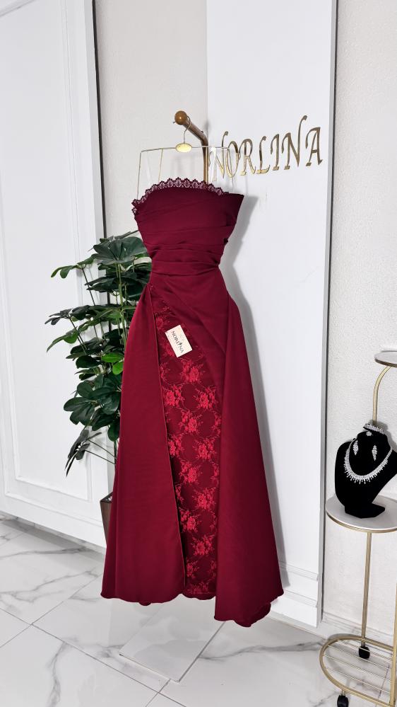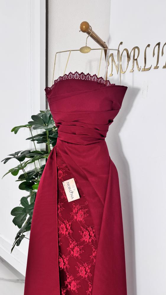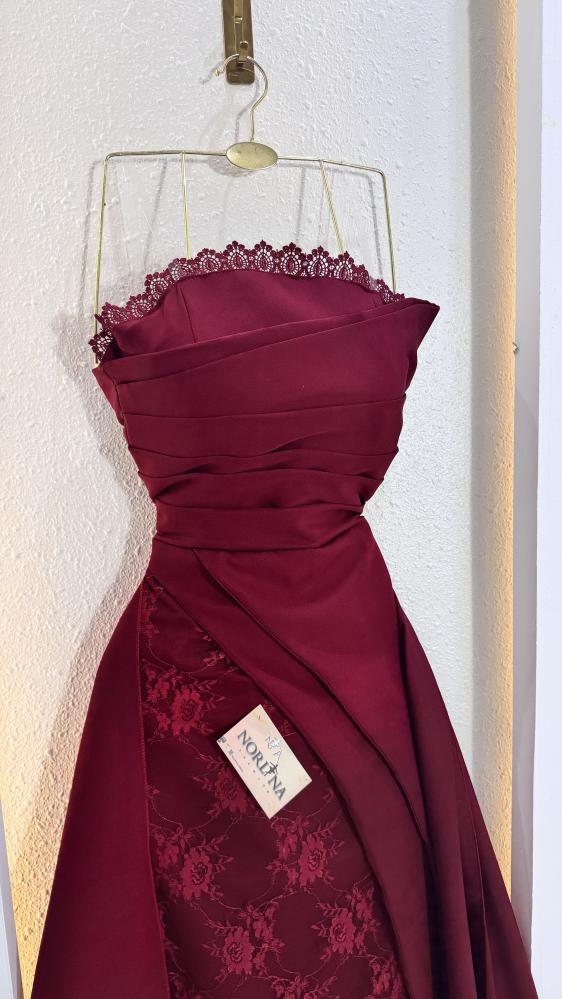 ويتميز الفستان بلون التوت أو العنابي الغني، بقصة "حورية البحر" الأنيقة. يتميز بتصميم أنبوبي بدون حمالات (Strapless) مع كسرات عند الصدر، وطبقة خارجية من القماش تتدلى بأناقة لتكشف عن بطانة داخلية من الدانتيل المطرز. مثالي لإطلالة راقية وفخمة في الحفلات الكبرى.