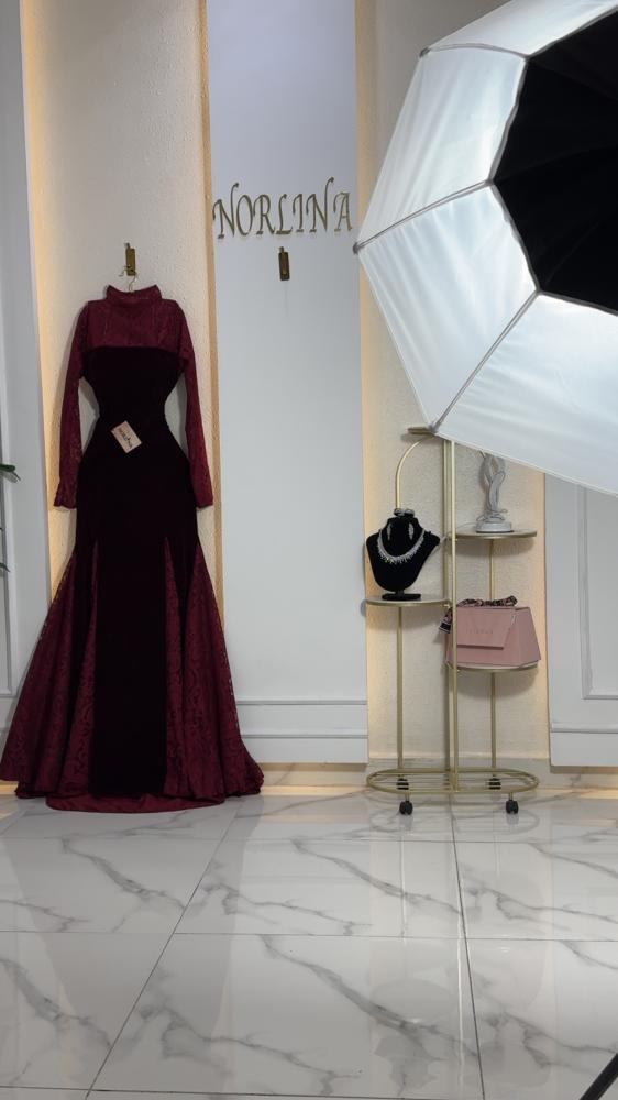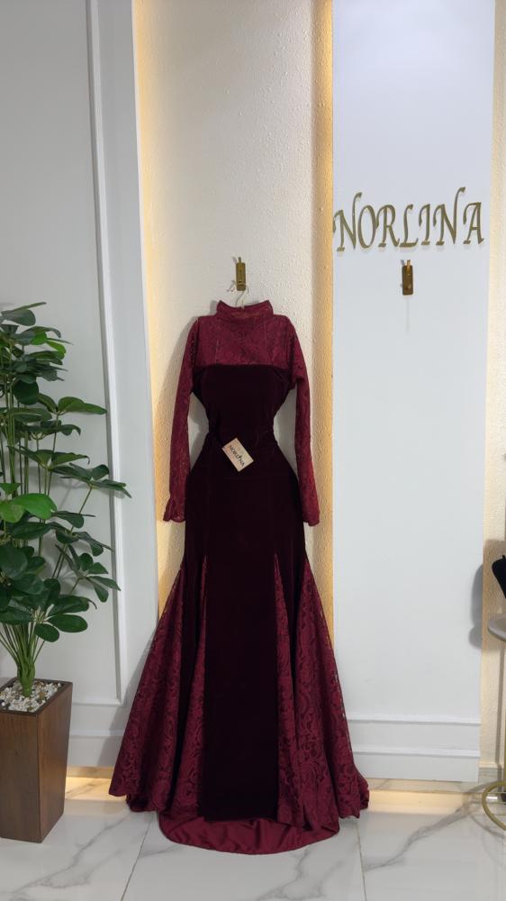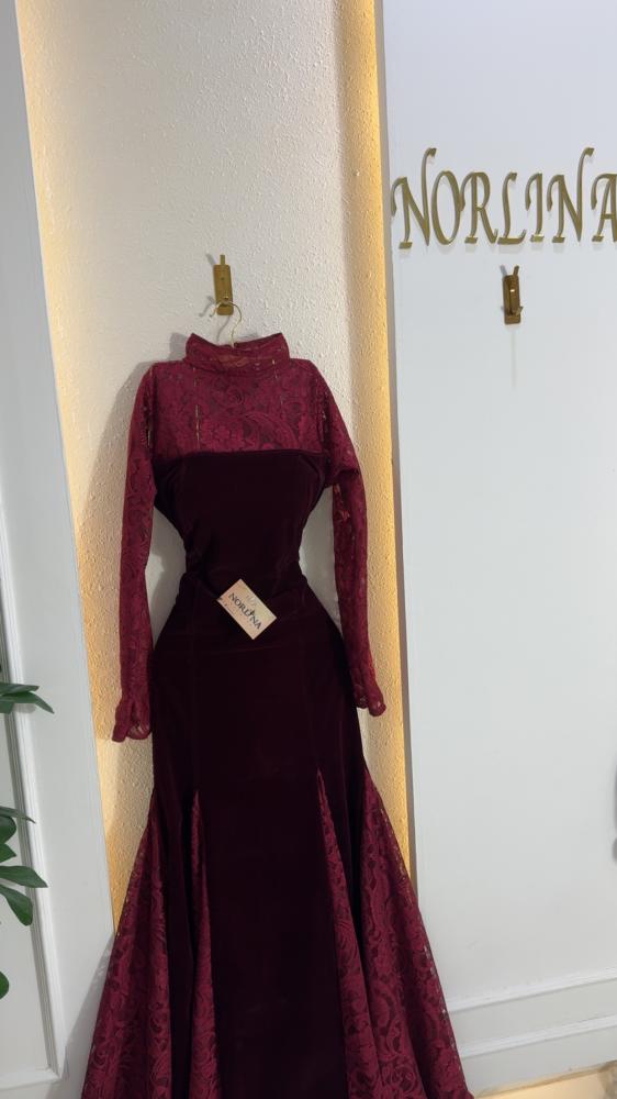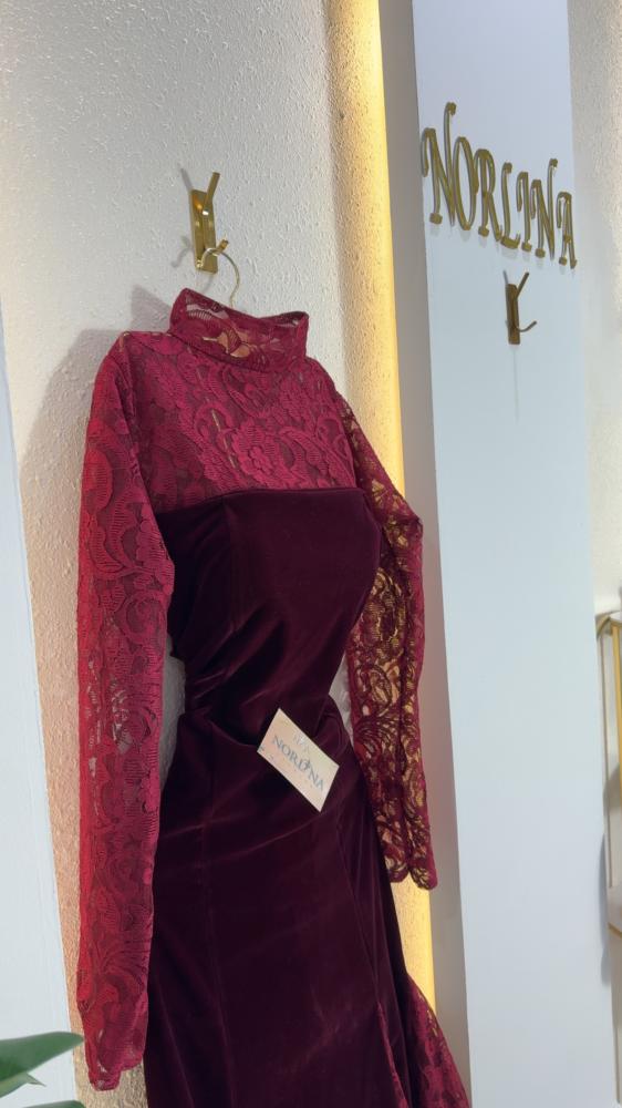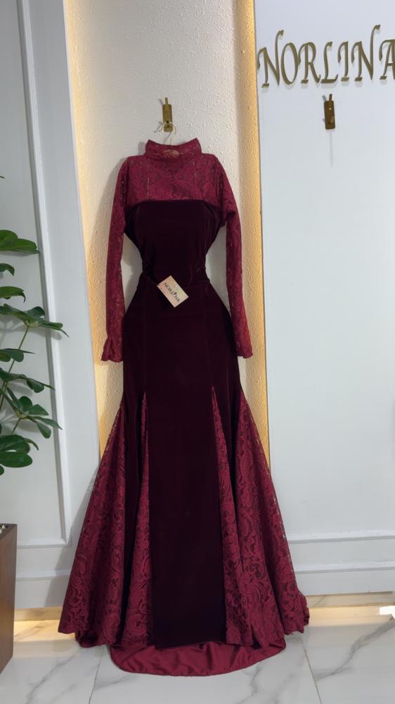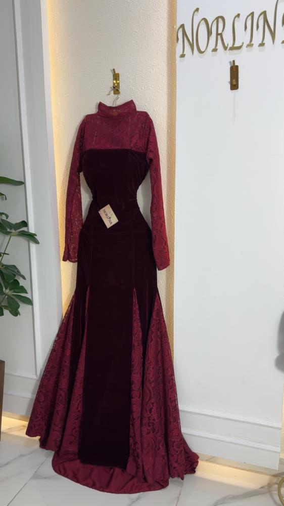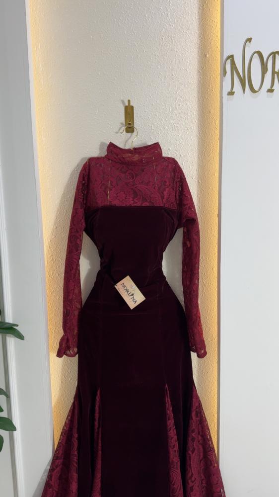 فستان سهرة ساحر من خامة الجوخ العنابي الداكن، يتميز بأكمام طويلة وأنيقة، وتفاصيل لامعة من الفصوص الفضي على حواف الأكمام ومنطقة الخصر، مما يضفي لمسة من البريق والرقي. القصّة طويلة وراقية تبرز القوام بجمالية