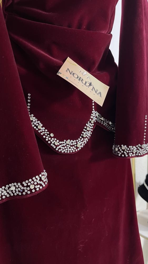 فستان سهرة ساحر من خامة الجوخ العنابي الداكن، يتميز بأكمام طويلة وأنيقة، وتفاصيل لامعة من الفصوص الفضي على حواف الأكمام ومنطقة الخصر، مما يضفي لمسة من البريق والرقي. القصّة طويلة وراقية تبرز القوام بجمالية