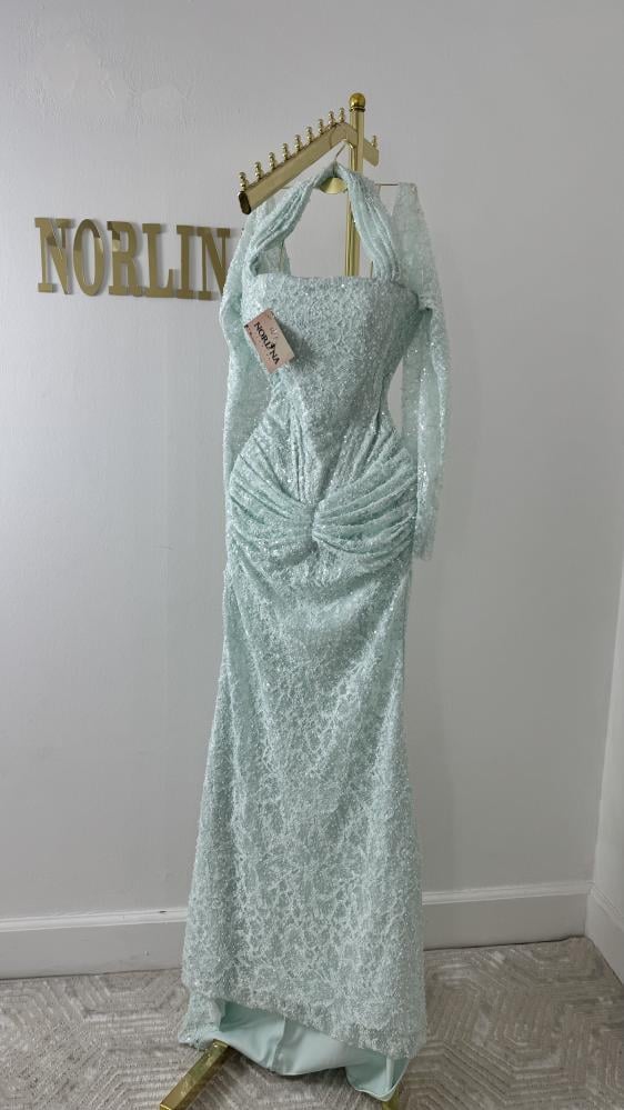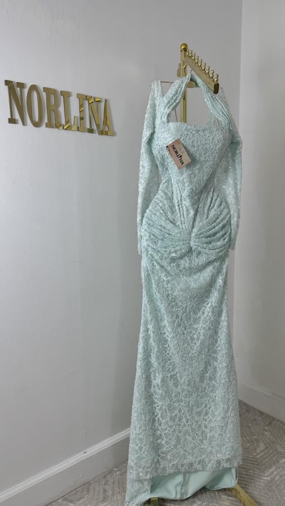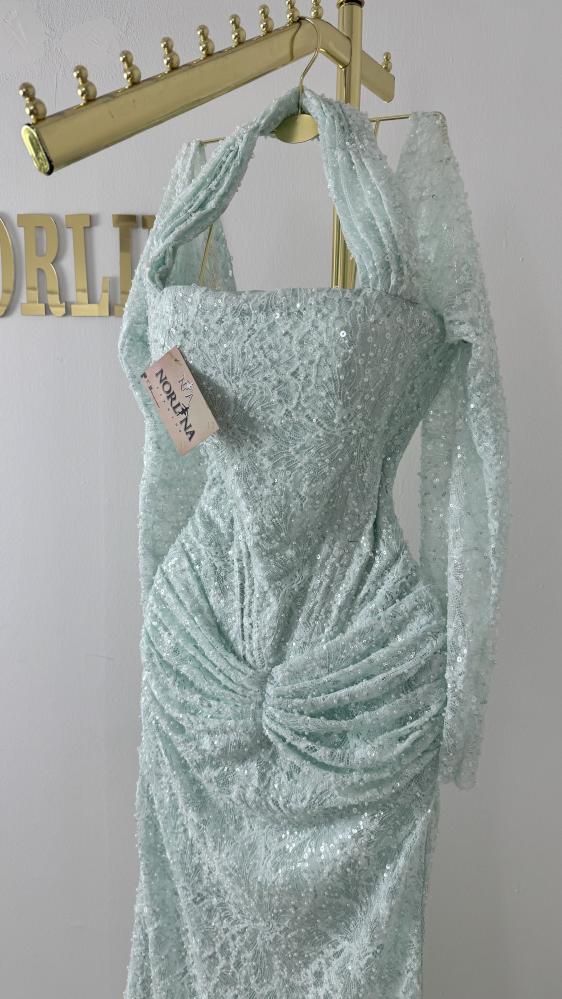يعكس الفستان نمط فساتين السهرة الرسمية، مناسباً للمناسبات الخاصة والحفلات الكبيرة
