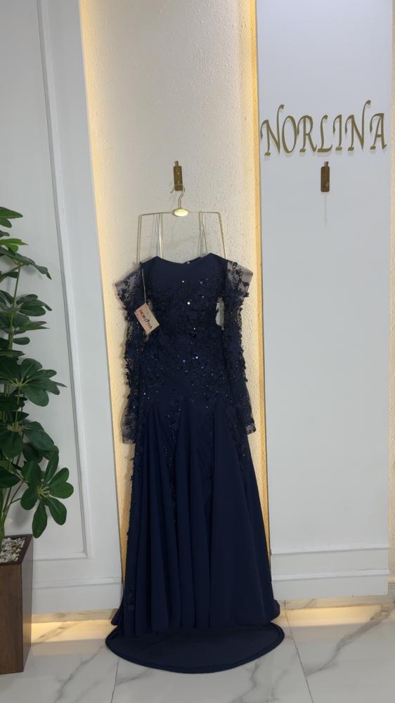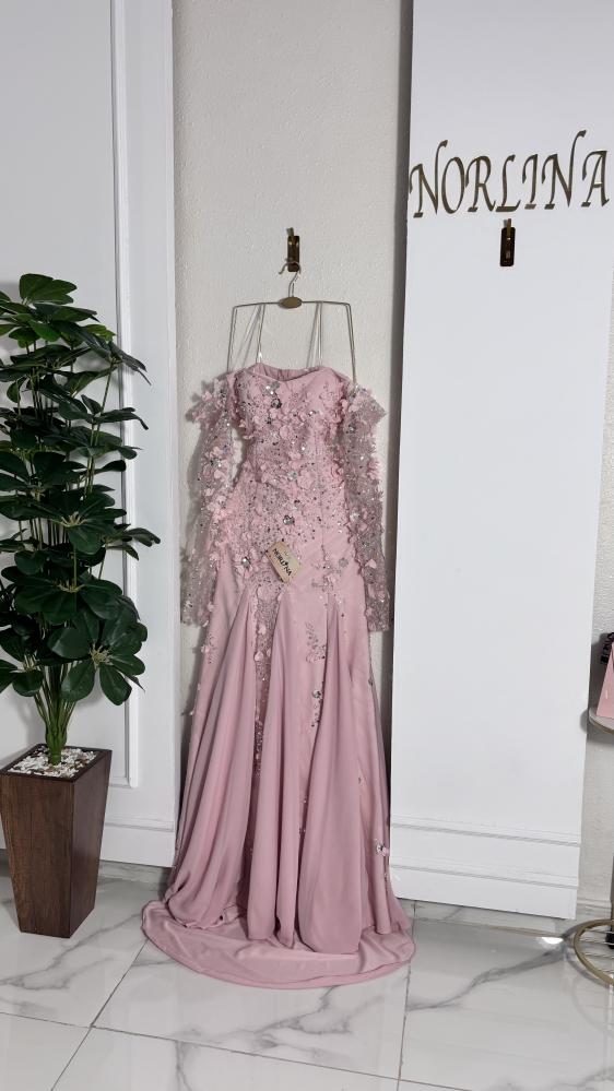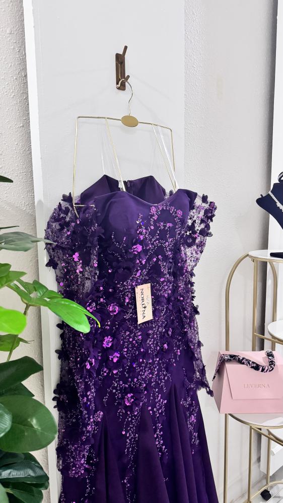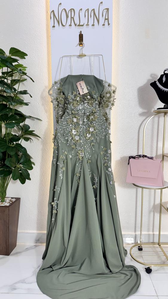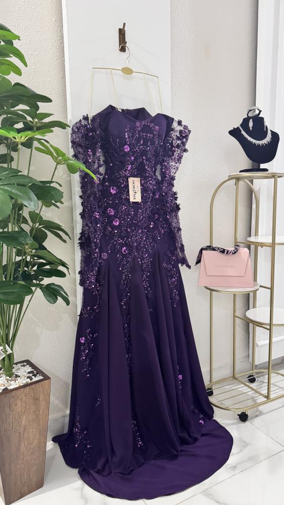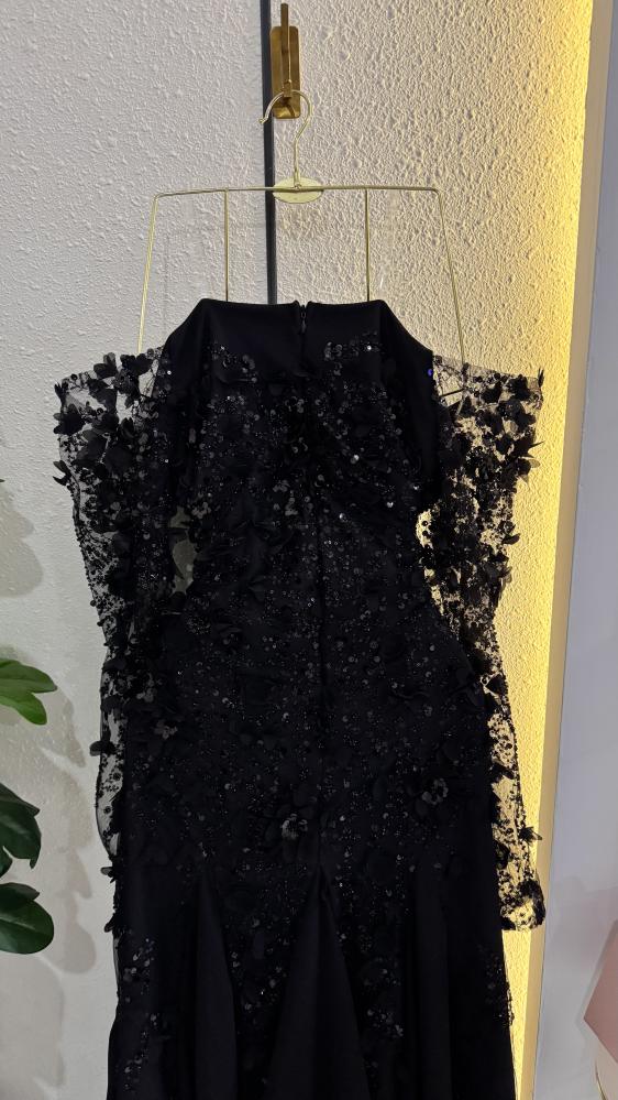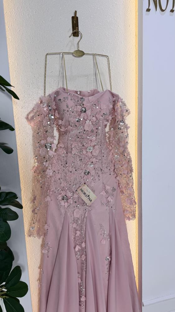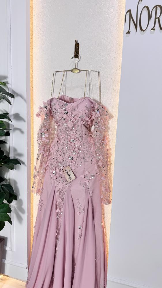 يتميز بأكمام شفافة مزينة بنفس تفاصيل الورود والترتر، مما يضيف لمسة من الأناقة والجاذبية.