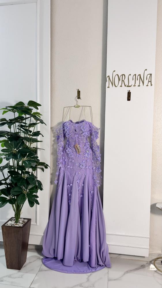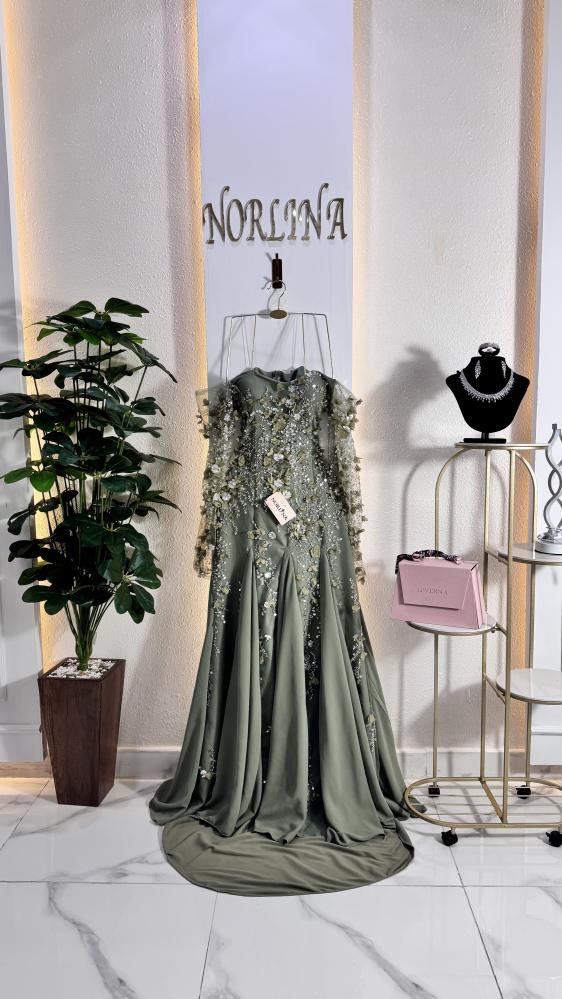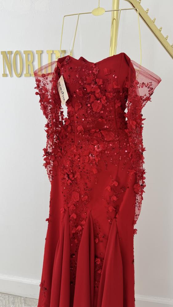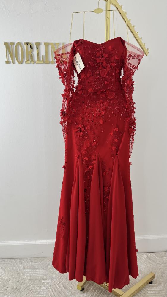 فستان سهرة طويل باللون الأحمر، مع تصميم حورية البحر الذي يبرز القوام، وتفاصيل مزينة بالورود ثلاثية الأبعاد والترتر اللامع على الصدر والجزء العلوي من التنورة.