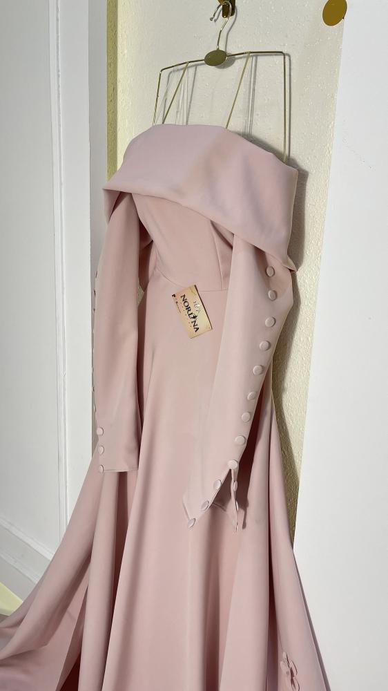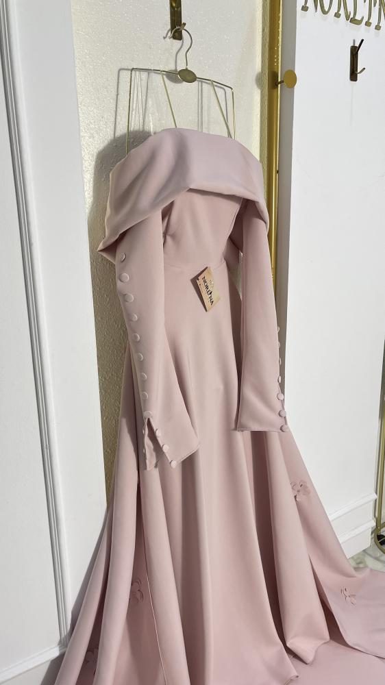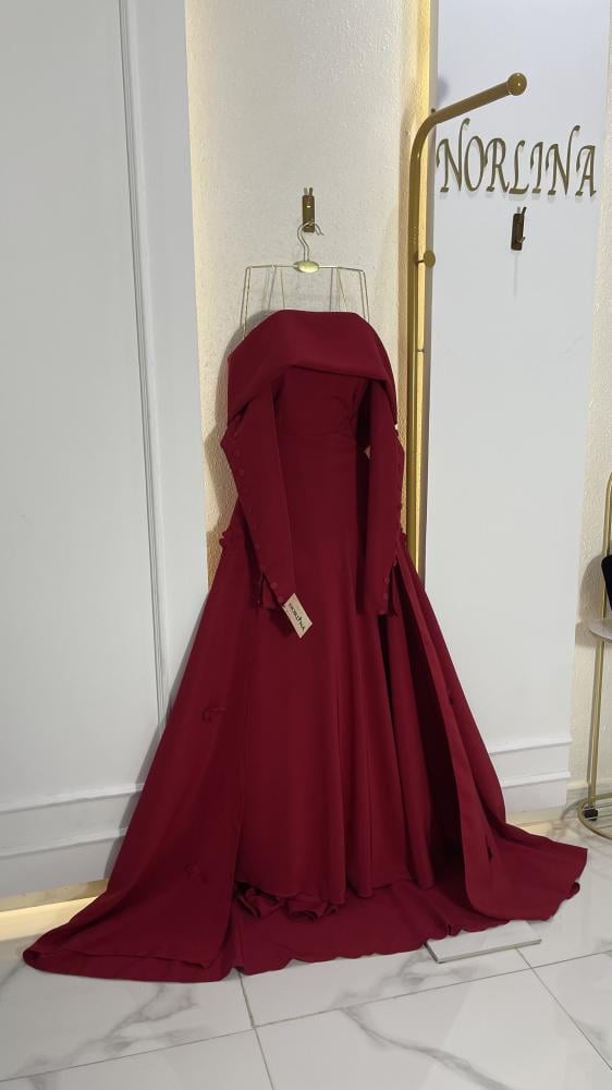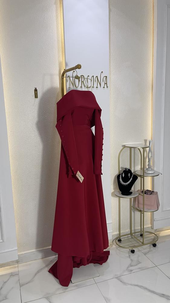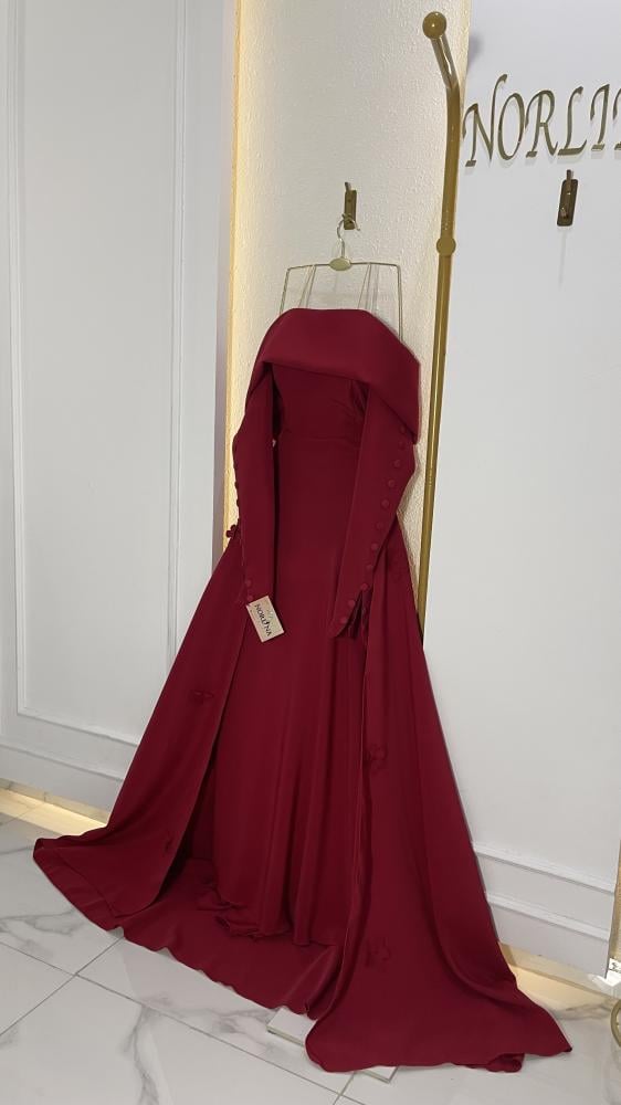 فستان سهرة ملكي بقصة كلاسيكية واسعة (A-line/Ball Gown) متميز بياقة الأكتاف المنسدلة (Off-Shoulder) التي تضفي جاذبية ورقة. يتميز بكمين طويلين مزينين بأزرار أنيقة، وذيل طويل ودراماتيكي. متوفر باللون الأحمر الداكن الجريء (Red) أو الوردي الهادئ الرومانسي (Dusty Rose). مثالي لحفلات الخطوبة أو السهرات الكبرى